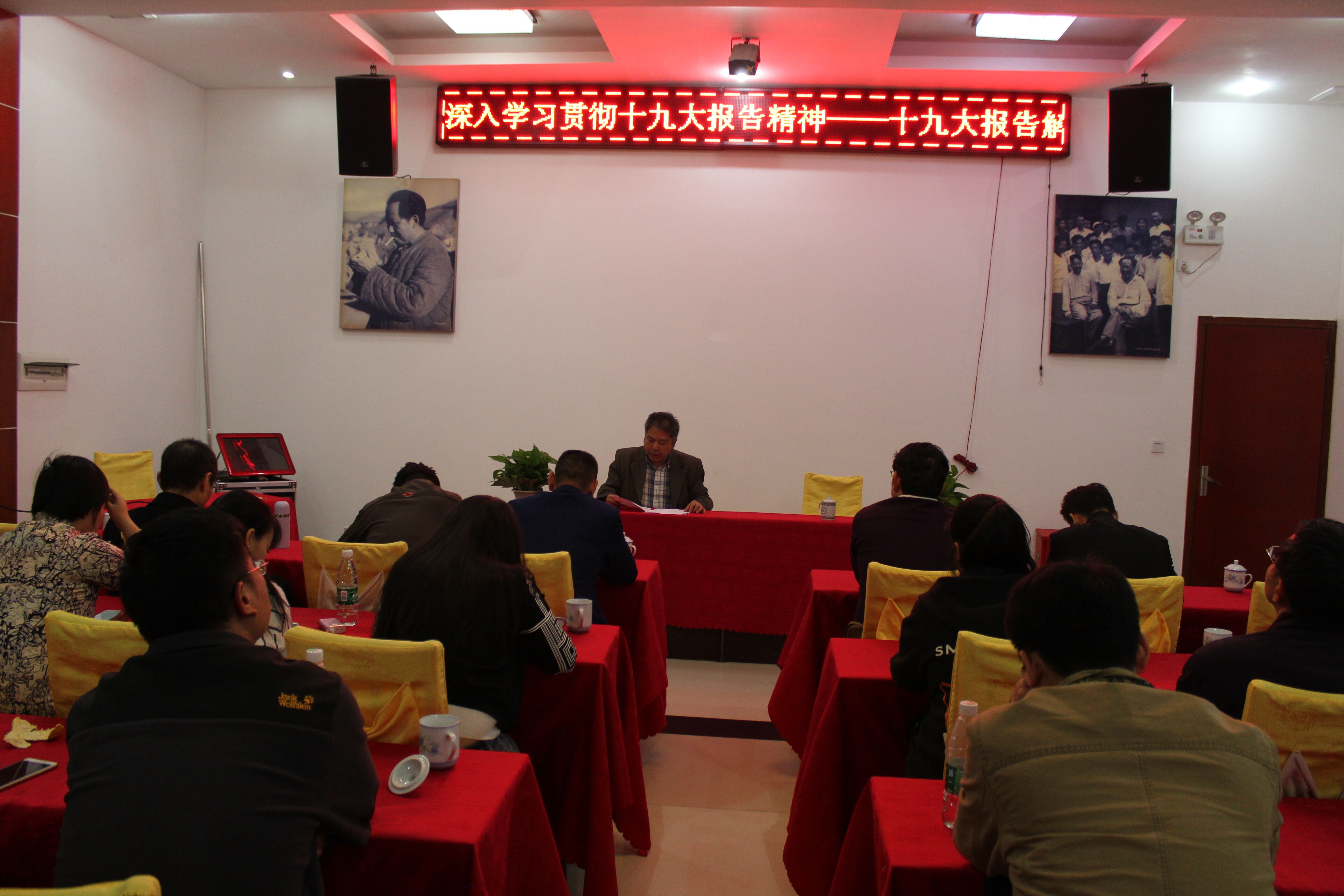 3日下午,党总支书记在韶山干部培训基地为全体党员解读十九大报告:十八大以来的成就是全方位的,开創性的,变革是深层次的,根本性的;“两步走”战略完整勾划了我国社会主义现代化建设的时间表,路线图;全面从严治党永远在路上,绝不能有任何喘口气,歇歇脚的念头。书记强调,学习、贯彻十九大精神将是全党今后一个时期的重要政治任务,全体党员要增强政治敏感性,使党的十九大进课堂、进头脑。要原原本本学习党的十九大精神,要立足工作岗位扎实学,全体党员以饱满的政治热情,扎实的工作作风,为全面实现两个一百年的奋斗目标努力工作。